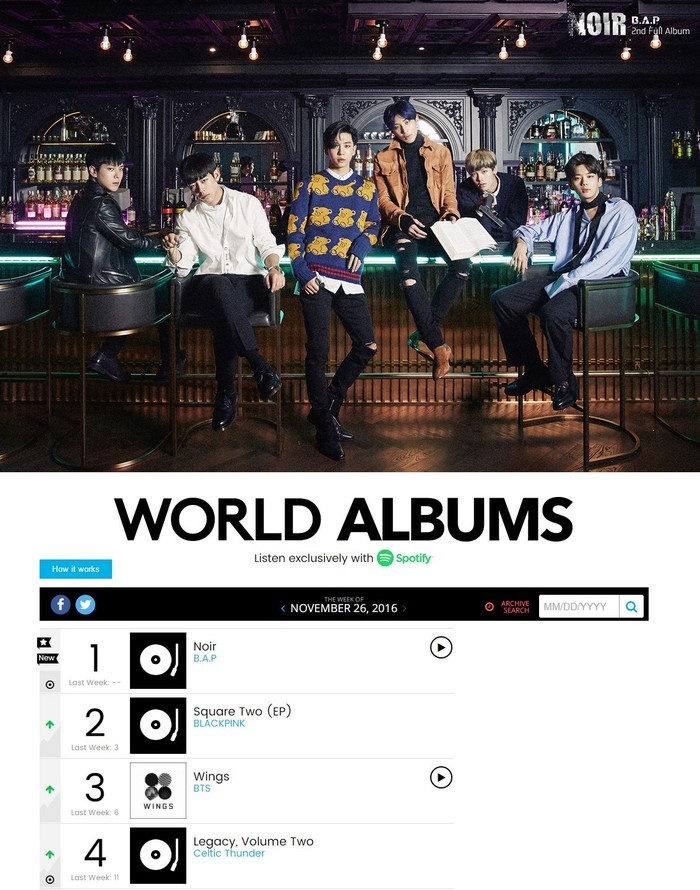 16일 미국 빌보드가 발표한 최신 차트에 따르면 B.A.P가 지난 7일 발매한 두 번째 정규앨범 ‘느와르’가 월드앨범차트에서 당당히 1위를 차지했다. 엑소 첸백시, 방탄소년단을 제치고 빌보드 월드앨범차트 1위에 오른 B.A.P는 앨범 발매와 동시에 아델, 레이디가가, 비욘세 등과 함께 한국 가수로는 유일하게 월드와이드 아이튠즈 앨범차트 상위권에 진입했다.