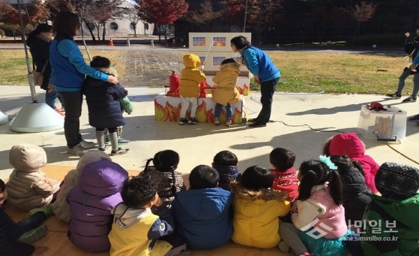 지난 15일 경기 여주시와 어린이집안전공제회는 신륵사 야외 공연장 일원에서 지역내 어린이집 만 3~5세 아동 80여명을 대상으로 '2016년 찾아가는 이동안전체험관' 교육을 실시했다. 사진은 어린이들이 소화기 체험을 하는 모습.(사진제공=여주시청)