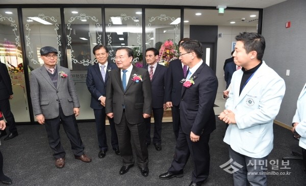 지난 15일 경기 양주시 검준공단에 새로 설치된 '경기북부 근로자건강센터 개소식'이 열렸다. 사진은 개소식에 참여한 이성호 시장이 관계자들과 이야기를 나누는 모습.(사진제공=양주시청)