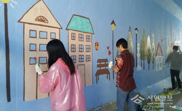 최근 경기 용인시 포곡읍 주민자치위원회는 영문중학교 학생들이 통학로로 이용하는 좁고 어두웠던 둔전리 45번국도 하부 통로에 벽화를 조성해 밝게 꾸몄다. 사진은 행사 참가자들이 벽화를 그려넣는 모습.(사진제공=용인시청)