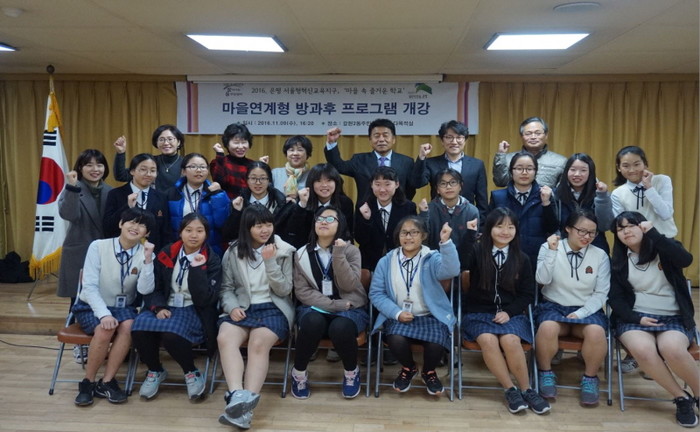 최근 은평구 갈현2동 주민센터 3층 다목적실에서 프로그램에 참여하는 20여명의 학생 등이 참석한 가운데 '마을연계형 방과후 프로그램 개강식' 행사가 개최됐다. 사진은 관계자들이 기념촬영하는 모습.(사진제공=은평구청)