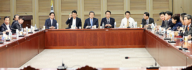 16일 오후 국회 의원회관에서 새누리당 비주류 주도의 비상시국준비위 회의가 열리고 있다. 이날 회의에는 정진석 원내대표와 김무성 전 대표, 오세훈 전 서울시장, 김문수 전 경기도지사 등이 참석했다.