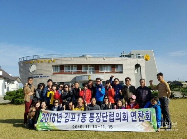 최근 경기 김포시 김포1동 통장단의 화합과 단결을 도모하기 위해 마련된 통장단 연찬회가 제주도에서 개최됐다. 사진은 연찬회에 참여한 관계자들이 기념촬영하는 모습.(사진제공=김포시청)