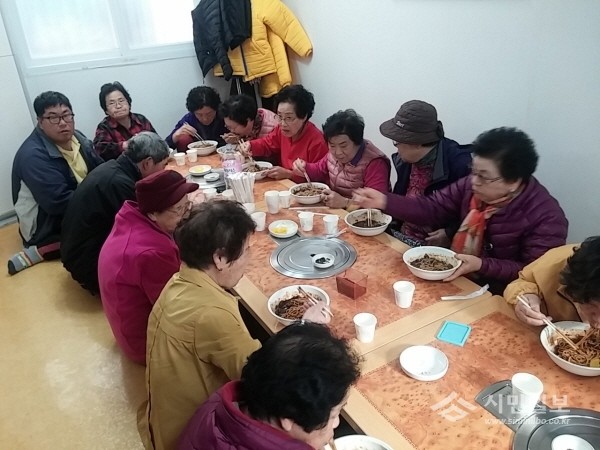 지난 16일 경기 양주시 회천1동 감동 365추진협의체는 회천1동 적십자봉사회 앞마당에서 지역 노인 100여명에게 짜장면을 대접했다. 사진은 행사에 참여한 노인들이 식사하는 모습.(사진제공=양주시청)
