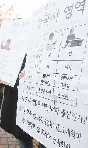 ‘2017학년도 대학수학능력시험’이 치러진 17일 오전 전북 전주시 완산구 기전여자고등학교에서 한 재학생이 국정농단 사태 중심에 있는 비선실세 최순실 씨를 비판하는 피켓을 들고 수험생을 격려하고 있다.