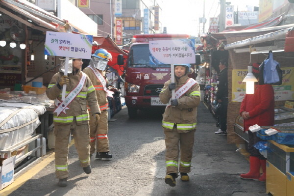 최근 서울 은평소방서는 겨울철 불조심 강조의 달을 맞아 응암동에 위치한 대림시장에서 '전통시장 소방차 길 터주기 캠페인'을 실시했다. 사진은 캠페인에 참여한 소방관들이 거리 홍보를 하고 있는 모습.(사진제공=은평소방서)
