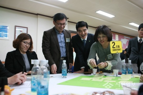 지난 17일 서울 강동구는 구청 대강당에서 ‘내가 바라는 강동구 아동친화도시 정책’을 주제로 '제40회 열린토론회'를 개최했다. 사진은 이해식 구청장(왼쪽에서 세번째)이 토론회 참가자의 활동을 살펴보는 모습.(사진제공=강동구청)