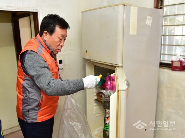 최근 제종길 경기 안산시장은 ‘행복家꿈 집수리 사업’ 현장을 방문해 봉사단체 '바름회(여성비전센터)', 안산시 건축사협회, 선부2동 사회보장협의회의 노고를 격려하고 봉사활동에 참여했다. 사진은 제 시장이 냉장고 내부를 청소하는 모습.(사진제공=안산시청)