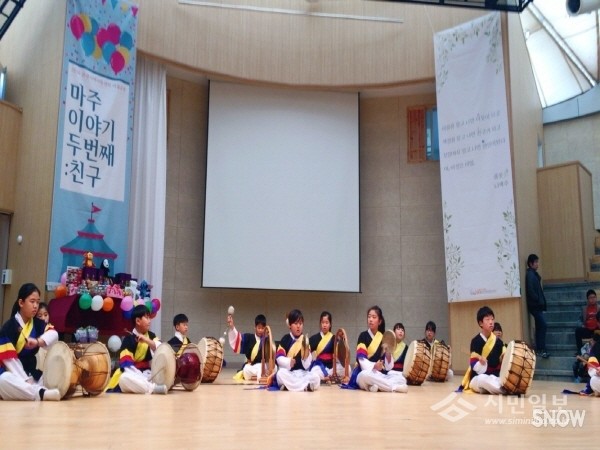 최근 서울 은평구 녹번동 청소년지도협의회와 은광지역아동센터는 은평문화예술회관 숲속극장에서 마을 아이들과 노인들이 함께하는 ‘마주이야기 두번째: 친구’ 공연을 펼쳤다. 사진은 아이들이 사물놀이 공연을 선보이는 모습.(사진제공=은평구청)