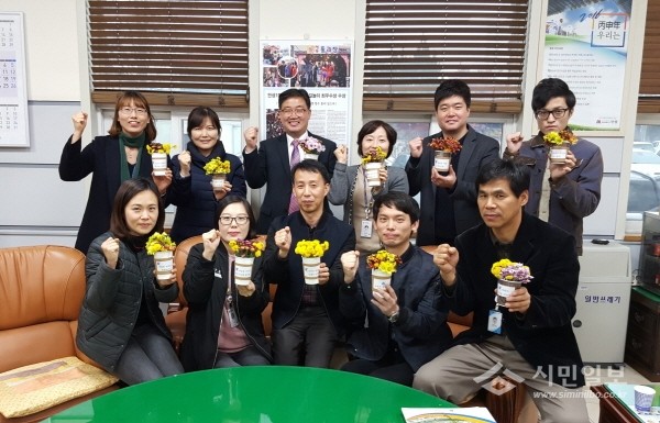 최근 경기 안성시 안성1동 주민센터는 청렴문화 확산과 정착을 위해 저마다의 청렴 표어를 붙인 '청렴 화분'을 만들어 민원대에 비치했다. 사진은 직원들이 자신들의 청렴화분을 들고 기념촬영하는 모습.(사진제공=안성시청)