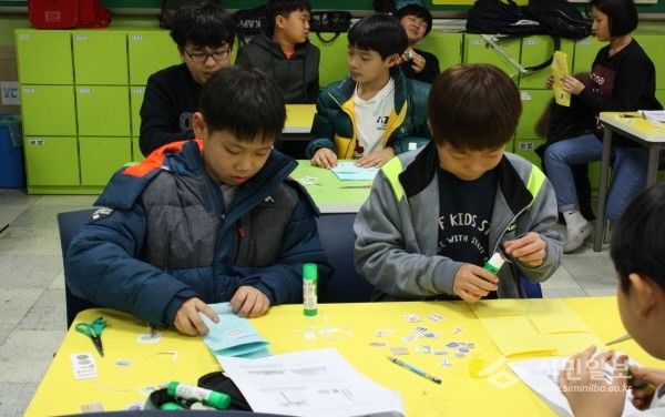 최근 경기 부천시에 위치한 옥산초등학교는 만화교실에서 강보민 역사논술 강사를 초청해 '역사 북아트' 수업을 실시했다. 사진은 수업에 참여한 학생들이 역사 연표를 만들고 있는 모습.(사진제공=옥산초등학교)