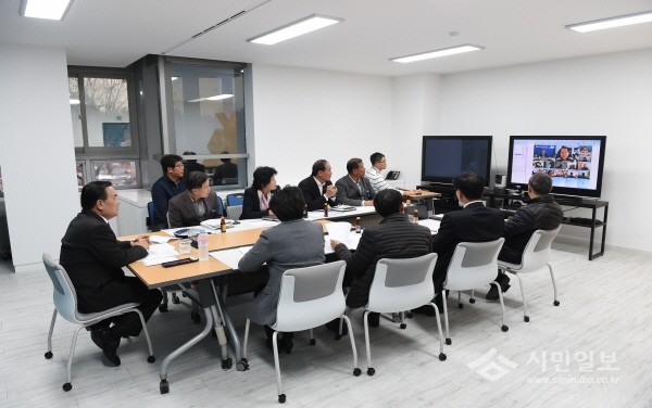 지난 21일 경기 양주시는 시청 영상회의실에서 재난 관련 합동대응체계를 강화하고 신속한 대응으로 대규모 재난을 예방하고자 '유관기관 PC 영상회의'를 개최했다. 사진은 이성호 시장(맨 왼쪽)과 관계자가 영상회의를 진행하는 모습.(사진제공=양주시청)