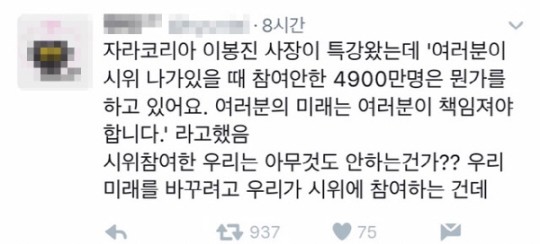 22일 사회관계망서비스(SNS) 등에 따르면 이봉진 사장은 “여러분이 시위에 나가 있을 때 참여 안한 4900만명은 무엇인가를 하고 있다”며 “여러분의 미래는 여러분이 책임져야 한다”고 말했다.
