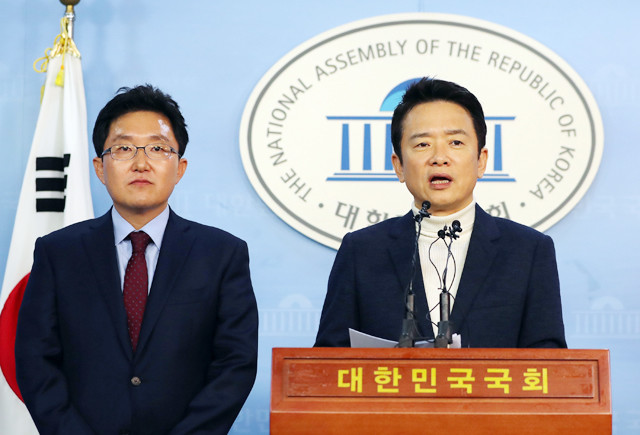 남경필 경기지사(오른쪽)와 김용태 의원이 22일 오전 국회 정론관에서 새누리당 탈당 기자회견을 하고 있다.