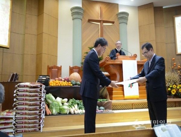 최근 서울 은평구 응암3동에 위치한 '서문교회'가 '사랑의 쌀' 1730kg(백미 10kg·173포)을 동에 기부했다. 사진은 교회 관계자가 예배당에서 '기탁식 행사'를 진행하고 있는 모습.(사진제공=은평구청)