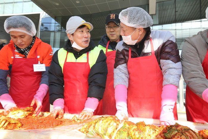 지난 23일 금천구는 구청 광장에서 기업봉사단 및 자원봉사캠프 등 200여명이 참여하는‘사랑海(해) 김장 나눔’행사를 개최했다. 사진은 차성수 구청장과 개그맨 이수근씨가 김치를 담그며 이야기를 나누는 모습.(사진제공=금천구청)