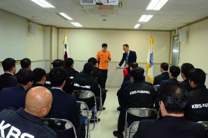 최근 영등포소방서는 여의도동 소재 KBS방송국에서 시큐리티 직원들을 대상으로 소방안전교육을 실시했다. 사진은 직원들이 소화기 사용 실습을 해보는 모습.(사진제공=영등포소방서)
