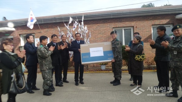 최근 경기 여주시 오학동방위협의회는 10여명의 위원들이 자매결연 한 육군 제3901부대를 방문, 43인치 대형 칼라TV 1대(70만원 상당)를 국군장병 위문품으로 전달했다. 사진은 관계자들이 기념촬영을 하는 모습.(사진제공=여주시청)