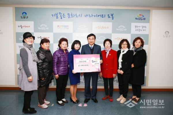 최근 서울 도봉구 초안산 노인문화센터 '청춘만세'가 자선행사 ‘나눔이 있는 따뜻한 청춘만세’의 수익금으로 마련된 따뜻한 겨울나기 성금 100만원을 구에 기탁했다. 사진은 이동진 구청장(오른쪽에서 네번째)과 관계자들이 기념촬영하는 모습.(사진제공=도봉구청)