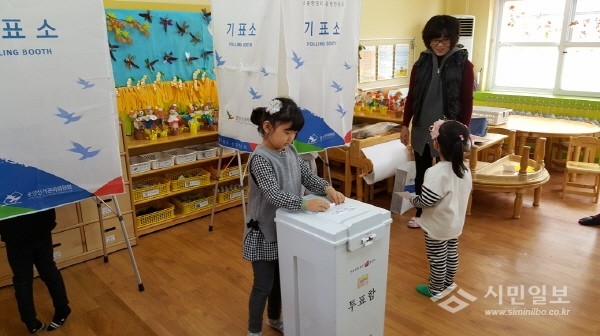 최근 경북 구미시 소재 고아초등학교 병설유치원은 원아 46명을 대상으로 선거관리위원회와 함께 '새싹유권자 선거체험교실'을 실시했다. 사진은 어린이들이 투표 체험을 하고 있는 모습.(사진제공=고아초등학교병설유치원)