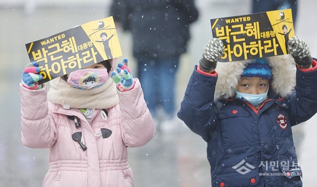 올 겨울 첫 눈이 내린 26일 박근혜 대통령 하야 촉구 촛불집회에서 어린이들이 피켓을 들고 있다.