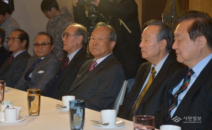 | ▲ 27일 오후 서울 중구 롯데호텔에서 열린 여야 전직 국회의장 등 정관계 원로 시국 회동에서 참석자들이 굳은 표정으로 앉아 있다. 박관용 전 국회의장(오른쪽 세번째)이 주최한 이번 모임은 김수한, 김형오, 정의화, 강창희 전 국회의장과 이홍구 전 총리 권노갑, 정대철, 신경식,신영균 전 국회의원, 송월주 스님 , 최성규 목사 등이 참석했다.(사진제공=연합뉴스) | ||