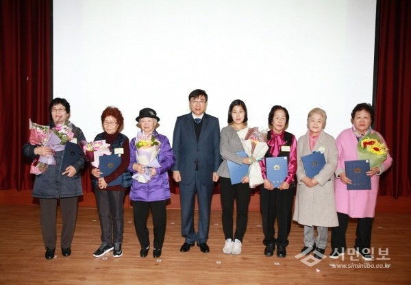 최근 서울 도봉구는 구청 다목적회의실에서 지역내 성인문해교육을 받는 노인을 대상으로 실시했던 '늘 푸른 어르신 백일장' 대회의 시상식을 개최했다. 사진은 이동진 구청장(왼쪽에서 네 번째)과 관계자들이 기념촬영하는 모습.(사진제공=도봉구청)