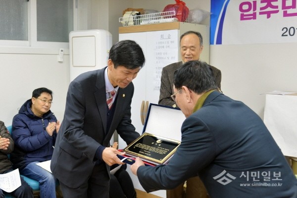 | ▲ 김현상 의원(왼쪽)이 주민으로부터 감사패를 받고 있다. | ||