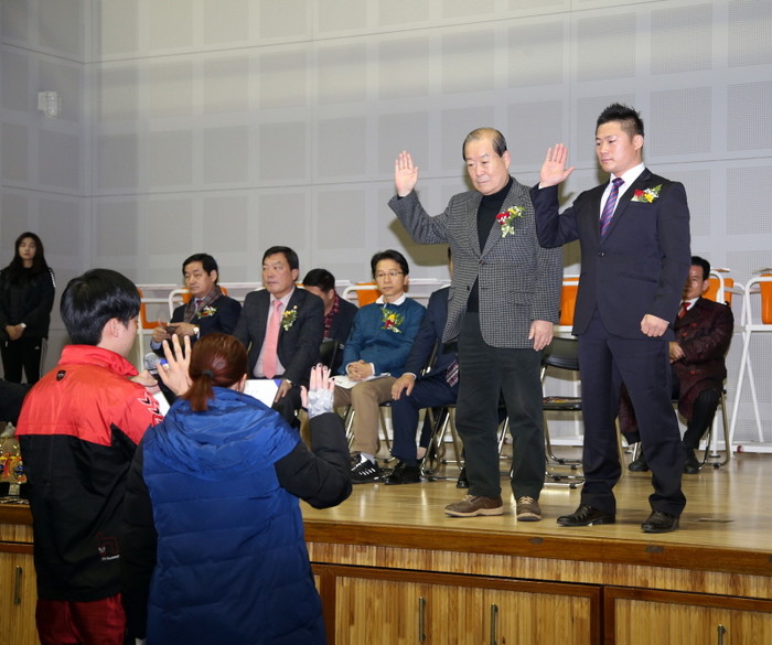 지난 26일 마포구는 마포구민체육센터 특설링에서 '제2회 마포구청장배 무에타이킥복싱대회'를 개최했다. 사진은 박홍섭 구청장(오른쪽에서 두번째)이 경기에 앞서 선수단 대표와 함께 선서를 하고 있는 모습.(사진제공=마포구청)
