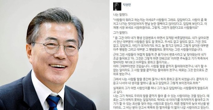 그의 글에 따르면 탁현민은 문재인에게 “사람들이 답답해한다. 확 치고 나가는 맛이 있어야 된다”고 말했고 문재인은 “인권변호사를 하면서 갖게 된 버릇이다. 평범함에도 못 미치는 사람들이 내가 조금만 듣고 반박하는 말에 주눅 들고 기가 팍 죽는 것을 보고난 이후로 사람들을 말을 끝까지 들어야겠다는 생각을 했다”고 대답했다.
