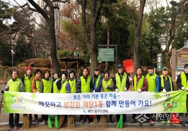 지난 25일 경기 수원시 영통구 매탄1동은 낙엽 일제 대청소의 날을 맞아 주공4·5단지 아파트 주변 낙엽을 청소했다. 사진은 청소에 참여한 관계자들이 기념촬영하는 모습.(사진제공=영통구청)