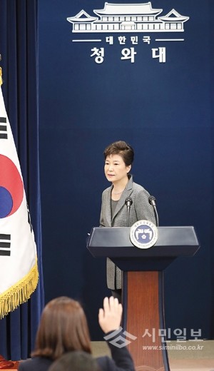 박근혜 대통령이 29일 오후 청와대 춘추관 대브리핑실에서 제3차 대국민담화를 발표한 뒤 돌아서자 한 기자가 손을 들어 질문이 있다고 표시하고 있다.