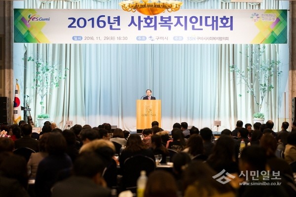 경북 구미시는 지난 29일 시사회복지협의회 주관으로 사회복지 종사자, 후원자, 자원봉사자 300여명이 참석한 가운데 '2016년 사회복지인대회'를 개최했다. 사진은 남유진 시장이 인사말을 하는 모습.(사진제공=구미시청)