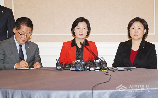 더불어민주당 추미애 대표가 30일 오전 국회에서 열린 야3당 대표 회동에서 발언하고 있다. 왼쪽부터 박지원, 추미애, 심상정.