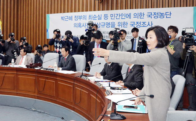 더불어민주당 박영선 의원이 30일 국회에서 열린 '박근혜 정부의 최순실 등 민간인에 의한 국정농단 의혹 사건 진상 규명을 위한 국정조사 특별위원회' 전체회의에서 검찰총장의 불출석 문제로 김성태 위원장과 설전을 벌이고 있다. 박 의원은 이에 항의하며 퇴장했다.