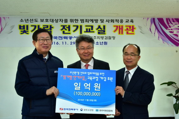 한전은 광주 소년원에 위치한 고룡 정보산업학교의 지하 1층 공간에 실습 교육장을 조성해 2017년 1~12월 빛가람 전기교실 전기기능사 자격증 취득반 시범 운영을 위한 기부금 1억원을 광주소년원에 전달했다.