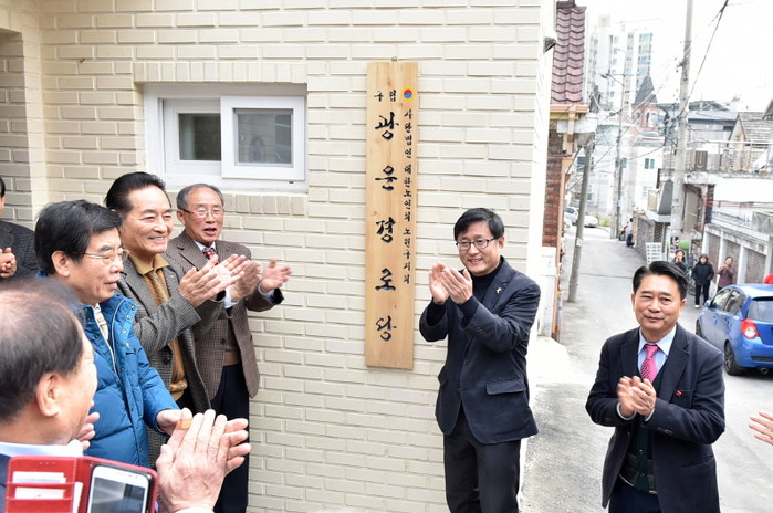 지난 30일 노원구는 월계동 지역 노인복지 사각지대를 해소하기 위해 신축한 구립 광운경로당 앞에서 경로당 현판식을 개최했다. 사진은 김성환 구청장(오른쪽에서 두번째)과 경로당 노인들이 현판 제막을 하고 있는 모습.(사진제공=노원구청)