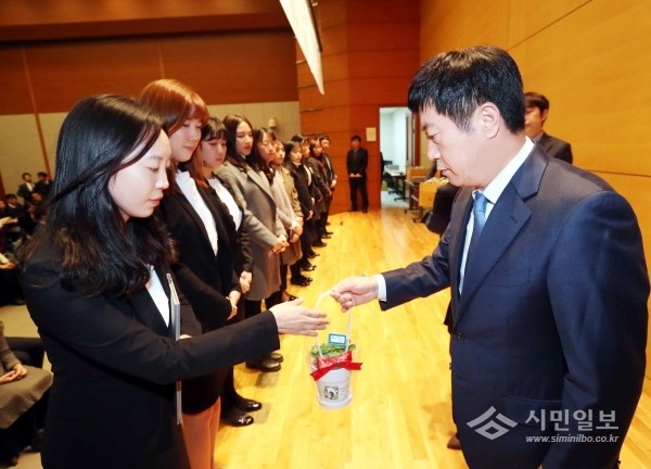 지난 29일 경기 용인시는 문화예술원 국제회의실에서 신규 공무원 139명에 대한 임용식을 개최했다. 사진은 정찬민 시장(오른쪽)이 신입 공무원에게 장미허브 화분을 전달하는 모습.(사진제공=용인시청)