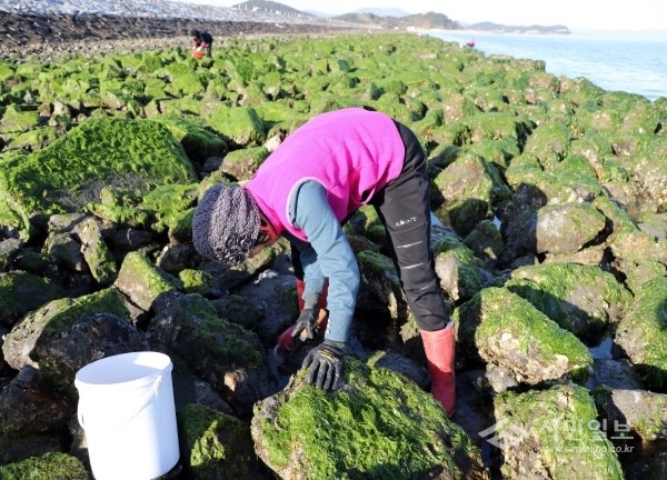 1일 전남 장흥군 관산읍 삼산방조제 인근 갯바위에 굴을 채취하기 위해 모인 마을 아낙들이 푸른 이끼로 가득 뒤덮인 바위 사이를 살펴보며 굴이 있는지 살펴보고 있다.(사진제공=장흥군청)