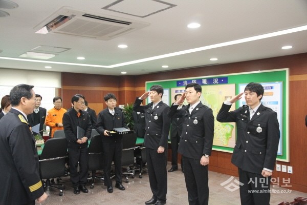 서울 구로소방서는 지난 1일 소방서 2층 서장실에서 팀장이상 간부가 참석한 가운데 승진한 소방공무원에 대한 임용신고를 실시했다. 사진은 승진자들이 장현태 서장에게 경례를 하는 모습.(사진제공=구로소방서)