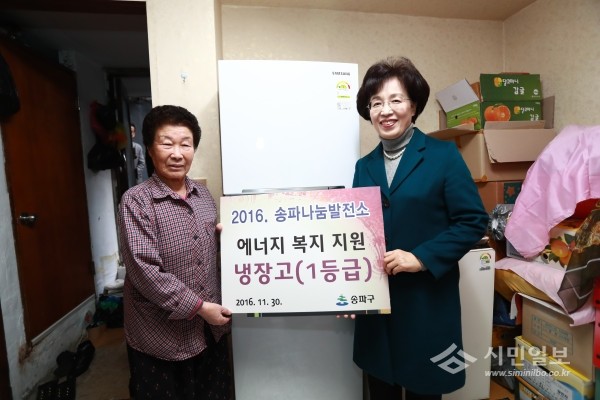 최근 서울 송파구는 ‘2016년도 송파나눔발전소 에너지복지 지원사업’의 일환으로 지역내 거주하는 홀몸노인에게 냉장고를 전달했다. 사진은 박춘희 구청장(오른쪽)이 홀몸노인에게 냉장고를 전달하고 기념사진을 촬영하는 모습.(사진제공=송파구청)
