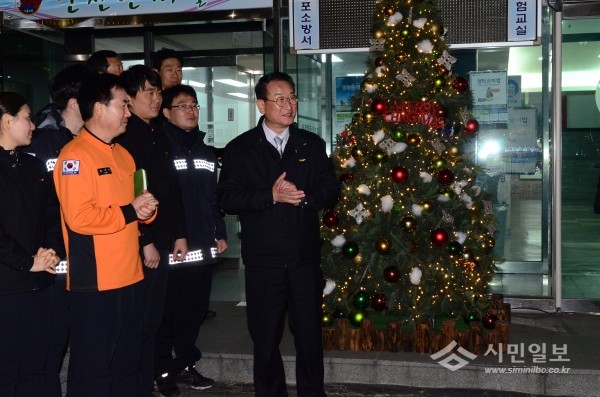 최근 서울 영등포소방서는 소방서 출입구에서 소방공무원 50여명이 참석한 가운데 크리스마스트리 점등식을 개최했다. 사진은 크리스마스트리 점등식 후 이귀홍 서장(오른쪽)이 직원들과 이야기를 나누는 모습.(사진제공=영등포소방서)