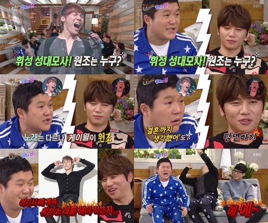 특히 그는 케이윌에게 밀리는 모습을 보였지만 이내 '음파공격'을 펼쳐 좌중을 웃음바다로 만들었다.