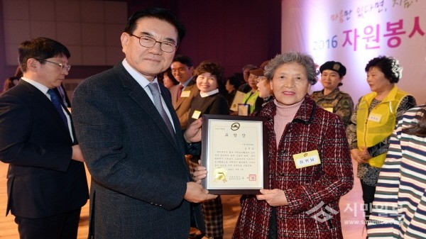 최근 서울 동대문구는 구청 강당에서 '마음만 있다면, 지금! 함께해요, 자원봉사'라는 주제로 '2016 자원봉사자의 날' 기념행사를 개최했다. 사진은 유덕열 구청장(왼쪽)이 수상자와 함께 기념촬영하는 모습.(사진제공=동대문구청)