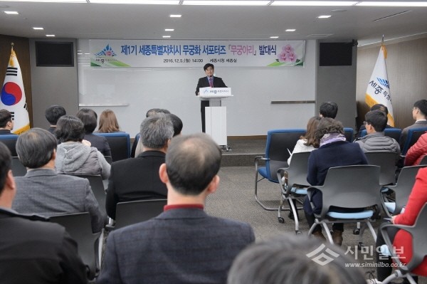 지난 5일 세종시는 시청 세종실에서 무궁화도시 사업을 홍보하고 무궁화가꾸기 등 활동을 이끌어갈 무궁화 서포터즈 '무궁아리'의 발대식을 개최했다. 사진은 이춘희 시장이 축사를 하고 있는 모습.(사진제공=세종시청)