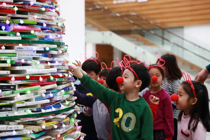 지난 5일 송파구가 대형 목재 서가대에 기부받은 800여권의 책을 층별로 쌓고 LED 전구 등으로 크리스마스트리처럼 꾸민 ‘책트리’를 만들고 구청 로비에 전시했다. 사진은 루돌프 분장을 한 아이들이 책 트리를 구경하고 있는 모습.(사진제공=송파구청)