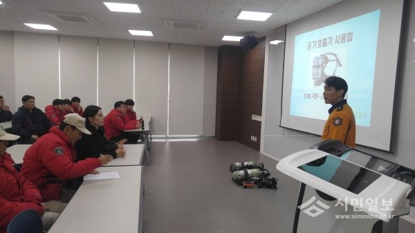 지난 5일 경기 여주소방서는 상거동에 위치한 프리미엄아울렛을 방문해 겨울철 화재 등의 재난사고에 대비한 '공기호흡기 설치대상 현장능력 향상 교육'을 실시했다. 사진은 소방관이 공기호흡법 사용법에 대해 설명하는 모습.(사진제공=여주소방서)