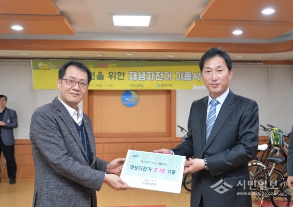 | ▲ 지난 11월4일 이창우 구청장(오른쪽)이 구청에서 김경태 동작지역자활센터장에게 재생자전거를 전달하고 있다. | ||