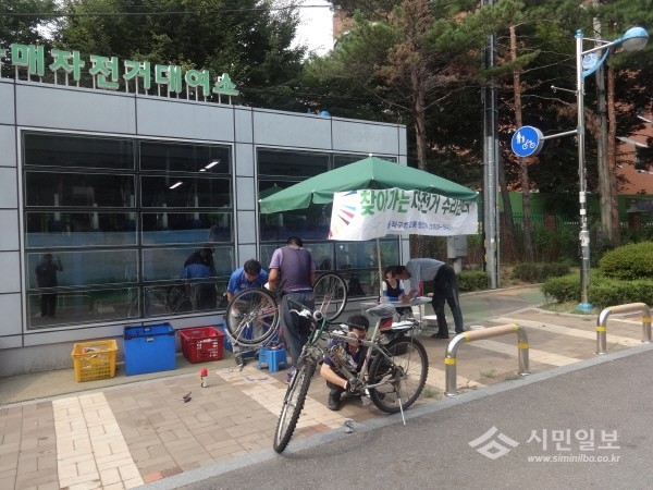 | ▲ '찾아가는 자전거 수리센터' 관계자들이 자전거를 고치고 있다. | ||