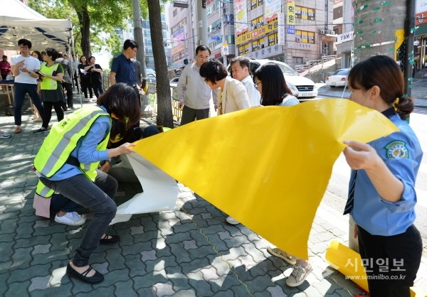 | ▲ 지난 5월19일 구청 직원들과 녹색어머니회 등 주민들이 사당동 삼일초등학교 앞에서 옐로카펫을 설치하고 있다. | ||